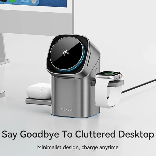 MagSpin 3-in-1 Smart Charger – Auto-Rotate Qi2 15W Fast Charge for iPhone, AirPods & Apple Watch (No Cables, Perfect Alignment)